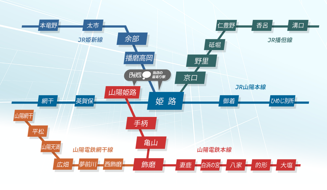 兵庫県姫路市青山西1-4-5 TEL:079-268-7755FAX:079-268-7775 営業時間 9:00~17:45定休日 日曜・祝日